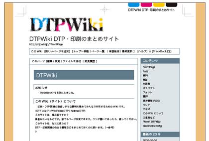 [dtp]DTPWikiのこと。昨日のことですが、DTPWikiにリンクを追加しようとしたら、なんだかエラーが出たようで、そのページにアクセスできなくなりました。一時的なモンかなと思ってほうっておいたのだけど、今見たらまだ直ってませんでした! いったいどうしたものでしょうか(T_T) ま、それはそうと(オイ!)、とりあえずささっとラフ作ってみましたです。色校ふうという、かなりベタな案ではありますが、一目で何を扱っているかがわかる判りやすさは重要だと思いました。だいたいこんな感じでいいでしょうかね(装丁なら3案くらいは出すとこですが……そこはそれ)。--