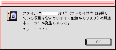 • 同じ .sit アーカイブを、StuffIt 7.03J で解凍すると、以下のようなエラーメッセージが出る場合があります。