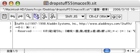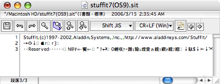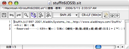 ヘッダ部は、おおむねテキスト形式になっているので、テキストエディタなどで開くことによって、ファイルが どのバージョンの StuffIt で圧縮されたかを確認できます。